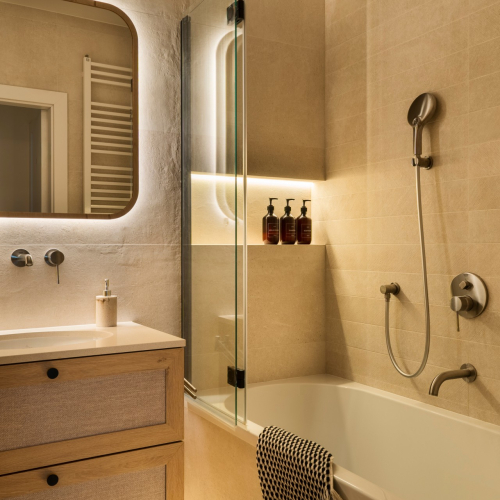 Minimalistyczna sypialnia dzięki cienkim lamelom na ścianie i subtelnym kinkietom nawiązuje do stylistyki japandi. W łazience zastosowano kafle imitujące kamień naturalny – po podświetleniu tworzą one niemal teatralny efekt. Druga, mniejsza łazienka pełni rolę toalety, pralni i pomieszczenia gospodarczego, co stanowi przykład praktycznego wykorzystania przestrzeni.