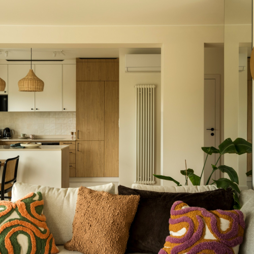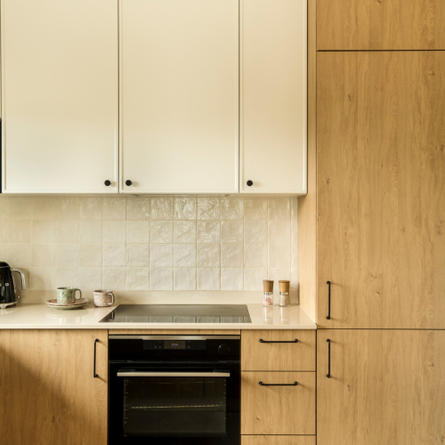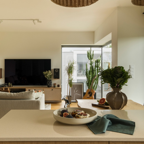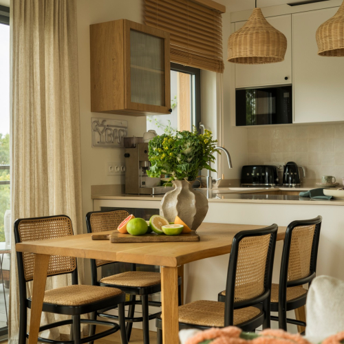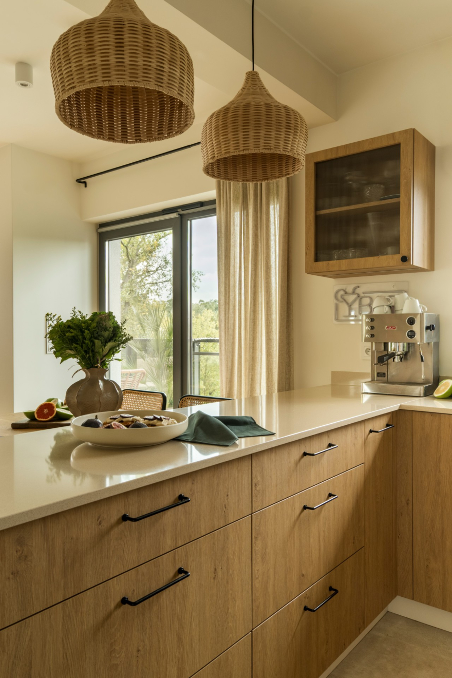 Blat w ciepłym tonie połączono z fartuchem za pomocą cokołu, co pozwoliło na precyzyjne ułożenie płytek - backsplash i spójne zestawienie materiałów. Na blacie zastosowano konglomerat kwarcowy od Technistone w kolorze Crystal Royal o neutralnym, ciepłym beżowo-kremowym odcieniu z subtelną strukturą, który nie narzuca się wizualnie, a jednocześnie dodaje wnętrzu miękkości i przytulności. Płyta indukcyjna zlicowana z blatem oraz podwieszany zlew sprzyjają utrzymaniu porządku. Beżowe cokoły i szafki wiszące nadają wnętrzu lekkości, a witrynka ze szkłem ornamentowym ciekawie uzupełnia półwysep. Od strony salonu pojawia się barek z ornamentowym szkłem, tworząc elegancką kompozycję. Całość dopełniają wiklinowe lampy i roleta.