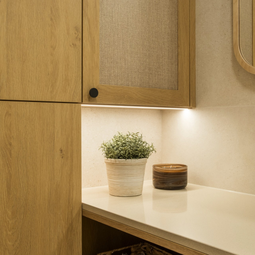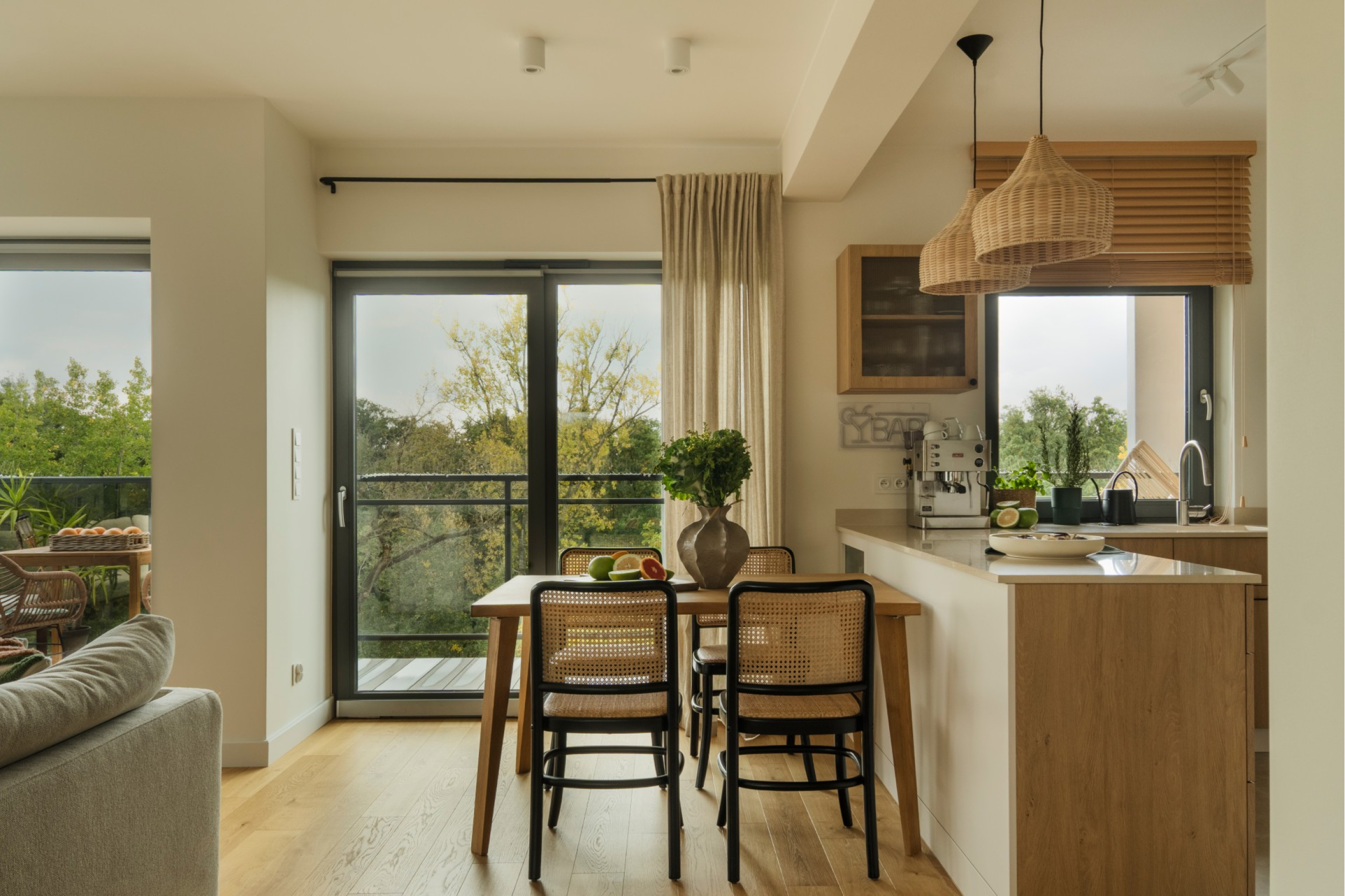 Il piano di lavoro in tonalità calda è stato collegato allo schienale tramite uno zoccolo, consentendo una posa precisa delle piastrelle e un insieme armonioso dei materiali. Sul piano è stato utilizzato un composito di quarzo Technistone nel colore Crystal Royal, una tonalità neutra e calda beige-crema con una texture delicata, che non domina visivamente ma dona morbidezza e accoglienza all’ambiente. Il piano cottura a induzione a filo con il piano e il lavello sottotop facilitano la pulizia. Gli zoccoli beige e i pensili rendono la cucina visivamente più leggera, mentre una vetrina con vetro ornamentale completa la penisola. Dal lato del soggiorno compare un banco bar con vetro ornamentale, creando una composizione elegante. Il tutto è completato da lampade in vimini e una tenda a rullo.
