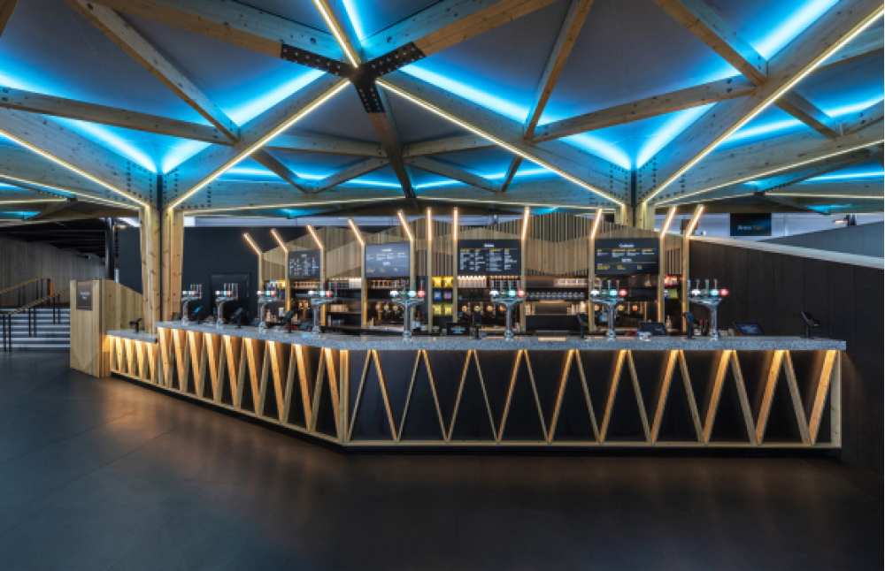 British architect and designer Sean Cooksley designed the bar, which is part of the concert hall. Like the concert hall itself, the bar is intended to provide an unforgettable experience for its visitors. The design of the bar corresponds to the overall concept of the interior of the building, which is inspired by the geometry of nature. It is dominated by intersecting vertical wooden columns and beams that create the feeling of being in a forest grove full of trees. The wooden elements in the bar stand out against a dark background. The contrasting color scheme is echoed in the bar's countertop, which is made from TechniStone® in the Taurus Terazzo White decor.